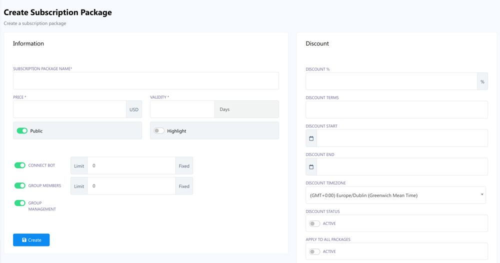 Managing packages involves editing and deleting tasks. While adding packages, information such as package price and validity period is required. You can also specify discount for a subscription package.
